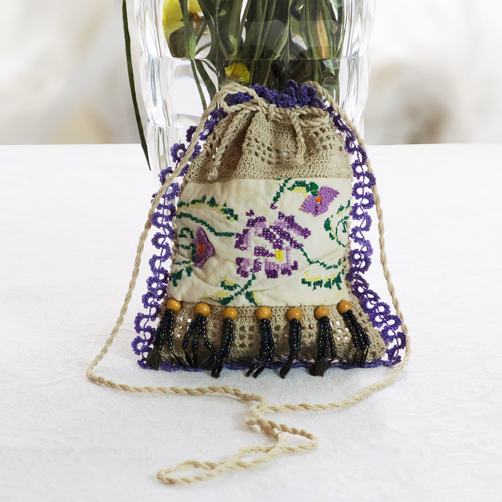 Gaia Tasarım Atölyesi tarafından Antika kese 1 tane hazırlanmıştır.Dantel ipliğinden örülmüştür ve el yapımıdır. Orta kısmında antika kanaviçe bulunmaktadır. Üzerinde boncuk işlemeyle süslenmiştir. Rahatlıkla omuzunuza çapraz asabilirsiniz. Cep telefonunuzu ve küçük cüzdanınız sığacak şekilde tasarlanmıştır.